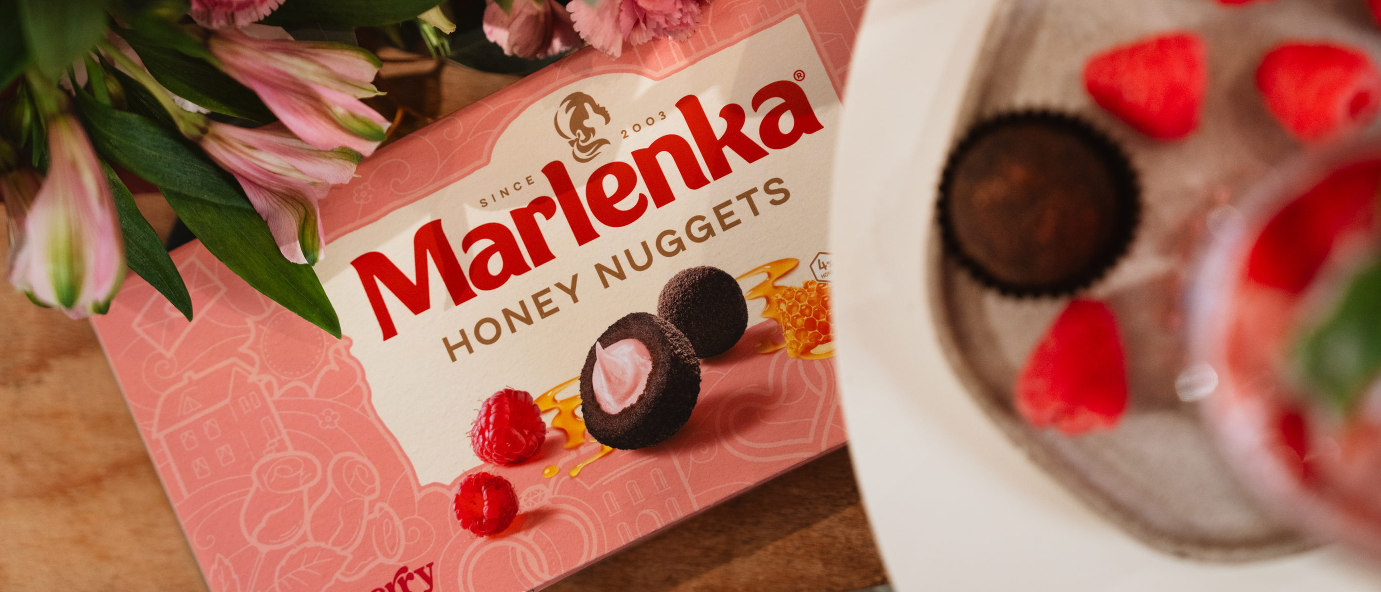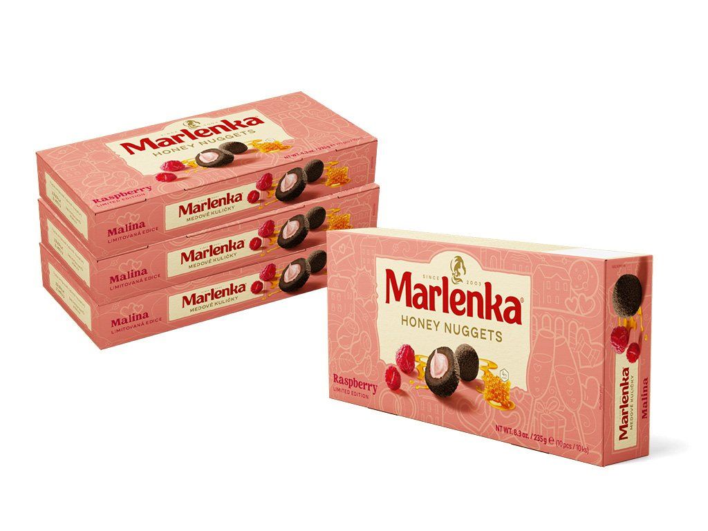Složení: cukr, mléko, pšeničná mouka, vaječná melanž, margarín [palmový tuk*, pitná voda, plně ztužený kokosový tuk, řepkový olej, emulgátory (mono- a diglyceridy mastných kyselin, slunečnicové lecitiny), jedlá sůl, regulátor kyselosti (kyselina citronová)], glukózový sirup, malinový sirup 7,8 % [cukr třtinový, pitná voda, koncentrovaná malinová šťáva 23 %, koncentrovaná citronová šťáva, koncentrovaná aroniová šťáva, barvicí koncentrát z mrkve a ibišku, přírodní aroma, zahušťovadlo (pektiny)], med 4 %, řepkový olej, kakao se sníženým obsahem tuku 1,5 %, pitná voda, alkalizovaný kakaový prášek 0,6 % [kakaový prášek se sníženým obsahem tuku 93 %, regulátor kyselosti (hydroxid sodný, uhličitan draselný)], kypřicí látka (hydrogenuhličitan sodný), přírodní aroma (obsahuje koncentrovanou šťávu z červené řepy), máslo, lyofilizované maliny 0,04 %.