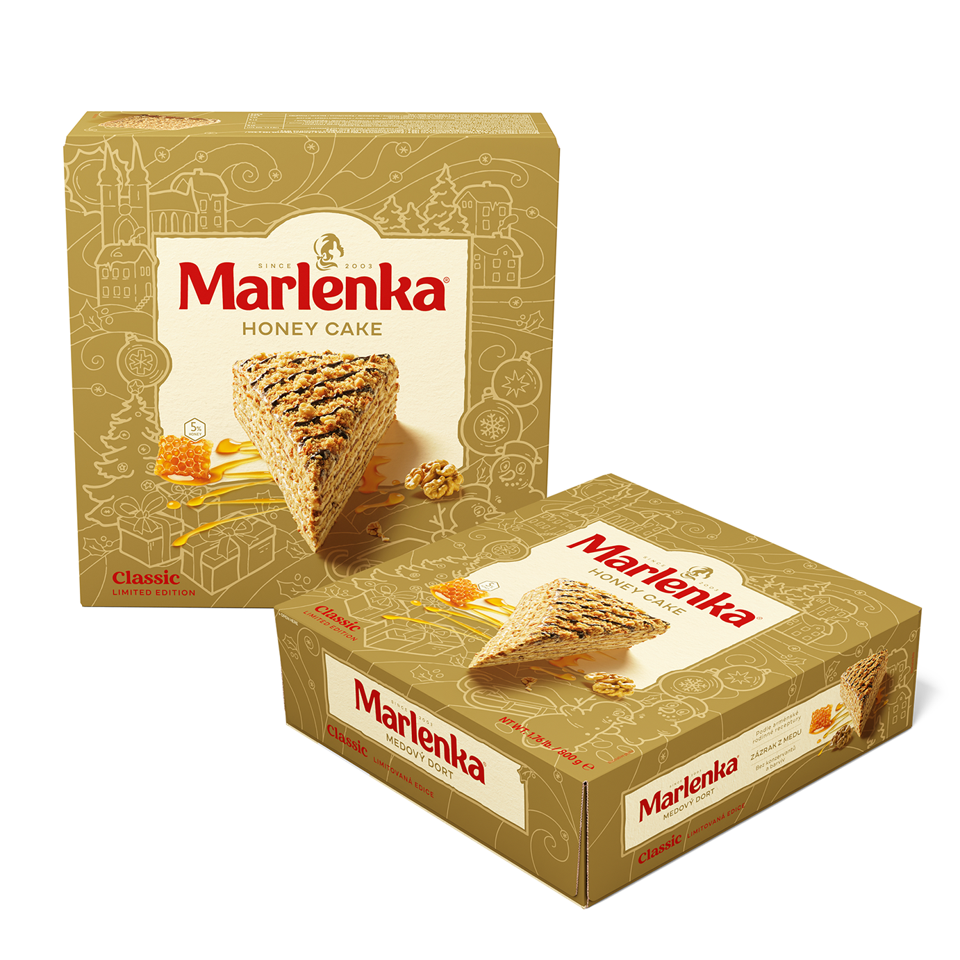 Unser beliebter MARLENKA® Honigkuchen mit Walnüssen kommt in einem limitierten Weihnachtsdesign mit wunderschönen Weihnachtsmustern, die jeden festlichen Tisch erstrahlen lassen!
